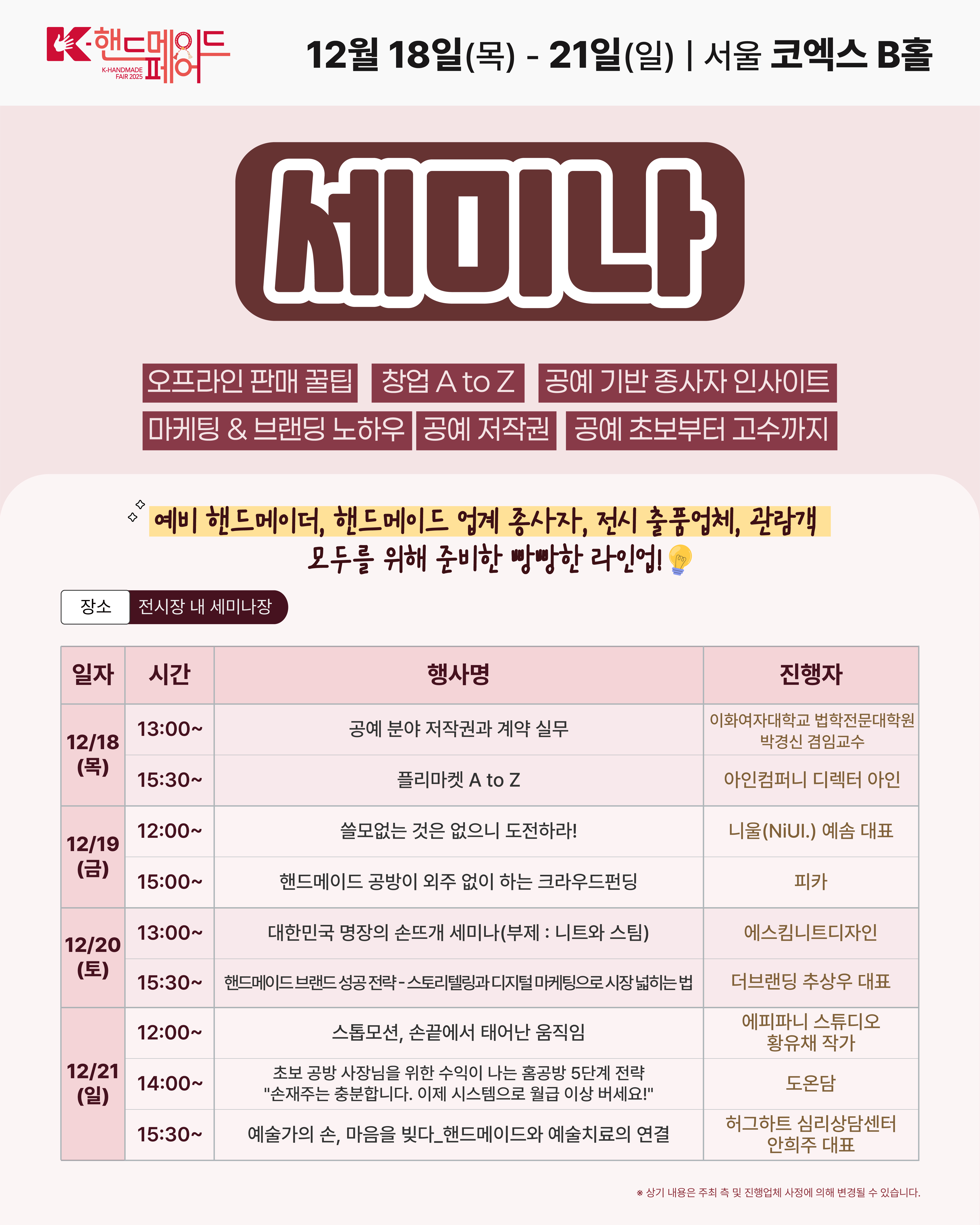 세미나 프로그램으로는 ▲공예 분야 저작권과 계약 실무 ▲플리마켓 A to Z ▲쓸모없는 것은 없으니 도전하라! ▲핸드메이드 공방이 외주 없이 하는 크라우드펀딩 ▲대한민국 명장의 손뜨개 세미나(부제: 니트와 스팀) ▲핸드메이드 브랜드 성공 전략-스토리텔링과 디지털 마케팅으로 시장 넓히는 법 ▲스톱모션, 손끝에서 태어난 움직임 ▲초보 공방 사장님을 위한 수익이 나는 홈공방 5단계 전략 ▲예술가의 손, 마음을 빚다_핸드메이드와 예술치료의 연결 등이 준비되어 있다. 실무 종사자와 출품업체 및 작가뿐 아니라, 예비 창작자·취미 입문자에게도 영감이 될 것으로 전망된다.